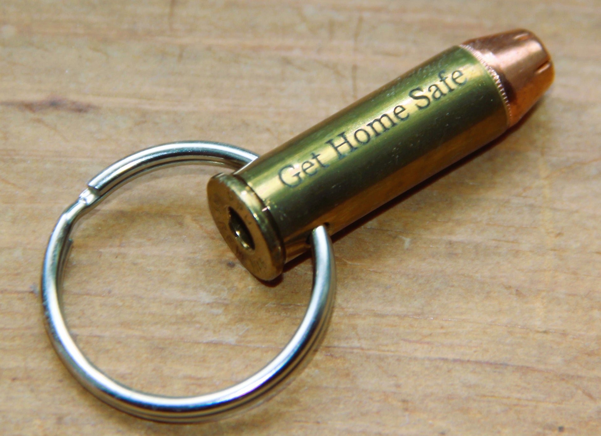These engraved keychains are made from recycled (once fired) brass. There is not gunpowder, or a primer installed. The cartridges are 100% inert and have a hole drilled through the case and a keyring installed to prevent confusion. These keychains are a great gift for the firearms or reloading enthusiast in your life.